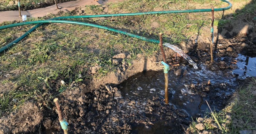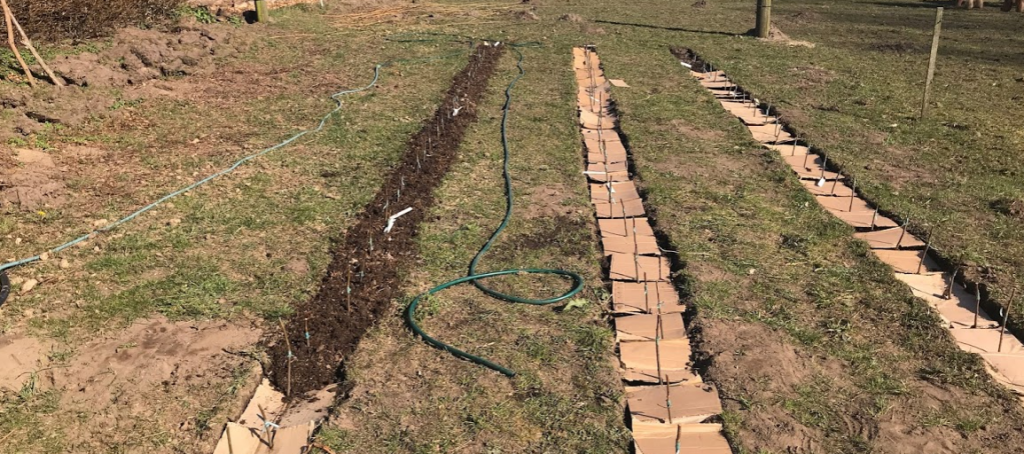 Efterfølgende blev hele herligheden ordentlig gennemvandet, der kom et lag pap omkring træerne og rillen blev fyldt op med champignonmuld fra Store Restrup.
