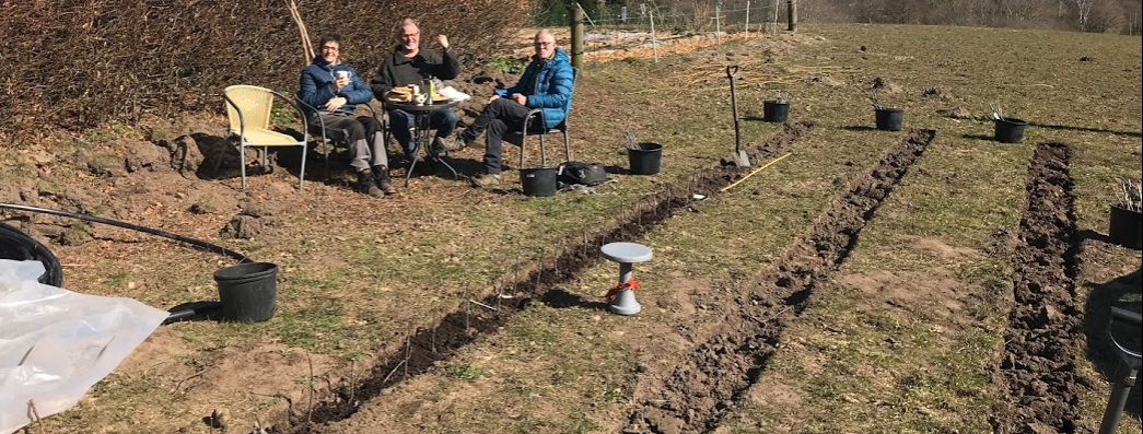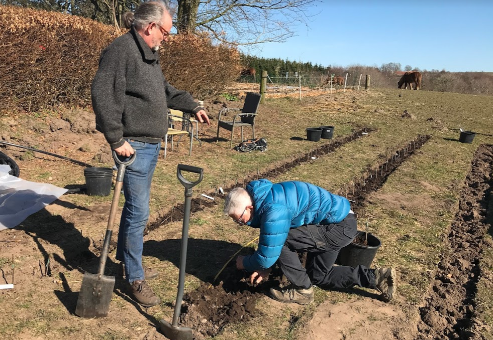 Så gjaldt det om at plante de nye træer. Til formålet havde Martin fjernet græstørv i 3 riller på 30 cm, med 90 cm afstand og 10 m lang. Derfor tog det ikke så lang tid at plante de 100 træer.