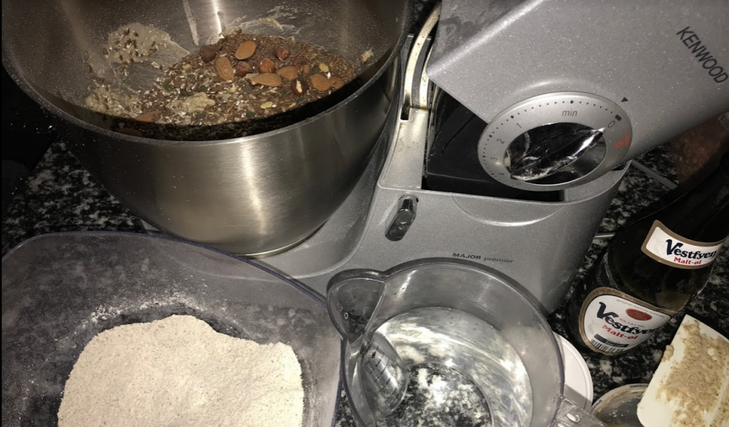 Surdej 9 dl vand 45 gr. salt 1 flaske hvidøl 100 gr. mandler 100 gr. solsikkekerner 150 gr. hørfrø 150 gr. hvedemel 500 gr. knækkede rugkerner 500 gr. rugmel Bland det hele sammen og rør godt. Tag 4 spsk. fra og gem som ny surdej Kom dejen i rugbrødsform. (jeg bruger silikoneforme, så behøver jeg ikke at smøre dem) Dæk brødet og lad det hæve i 12 – 24 timer. Sæt i kold ovn. Bag 1 time 15 minutter ved 180 grader.