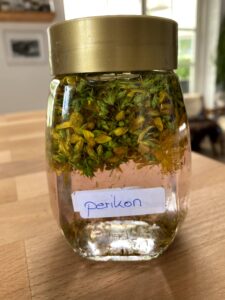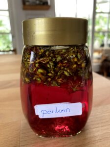 Opskriften er simpel: pluk en stor håndfuld af de næsten udsprungne blomsterknopper i juli (du kan kende perikonplanten på at du får røde fingre, når du maser knopperne). Put dem i et glas og fyld op med smagsneutral alkohol på mindst 38 %. (jeg plejer at bruge vodka).