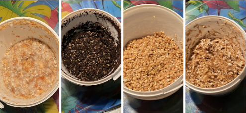 bøgespåner, kaffegrums, opblødte hvedekerner, fintsnittet halm