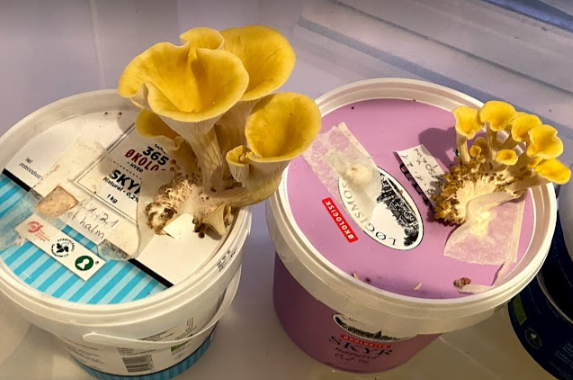 Beholderen med kaffegrums blev hurtig overtaget af en ulækker skimmelsvamp og kasseret. I de resterende beholdere bredte mycelium sig fint og efter nogle uger kom de ud fra den varme mørke køkkenskuffe i en lys, men nordvendt vindueskarm.