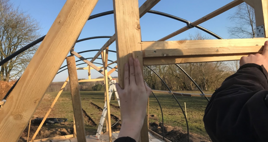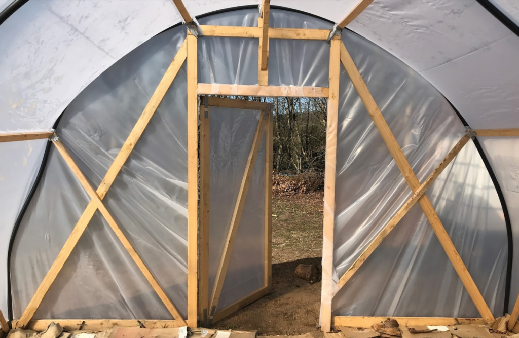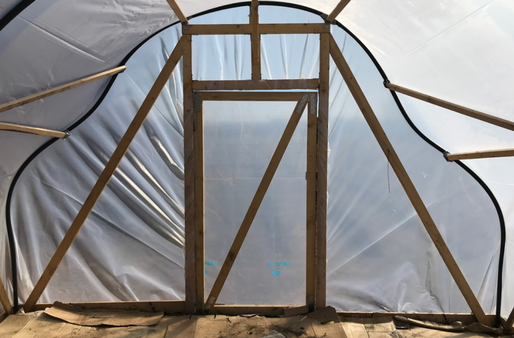 Den sværeste del var nok at stramme folien omkring dørene. Her viste det sig igen at PEM-rør er mere bøjelig end der er godt. Vi fik i hvert fald nogle smukke organiske former på øst-siden, hvorefter vi sætte flere afstiver ind på vestsiden.