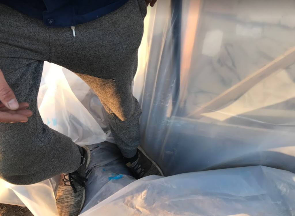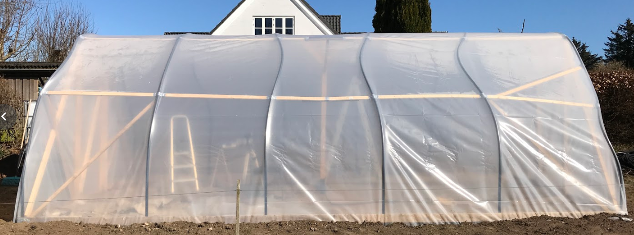 Efter at have spændt folien godt ind på listerne i toppen af dørene i begge ender, gældt det om at grave den ned på langsiderne. En god måde at gøre det på, er at stramme folien med den ene fod og træde den ned med den anden, mens der fyldes jord på.